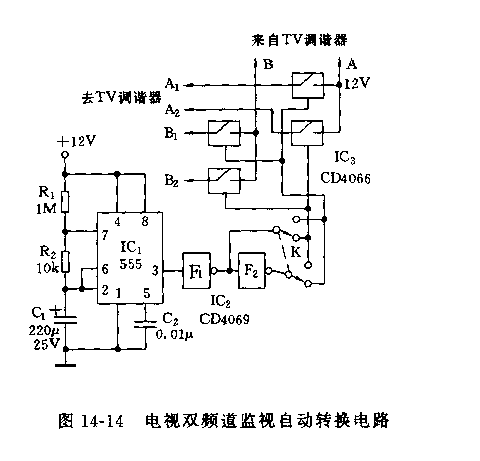您现在的位置是:首页 > 电路图 > 555电路图 > 555电路图 555电视双频道监视自动转换电路 转载来源:电子技术应用-AET chinaaet.com 电子发烧友 elecfans.com2017-03-23 简介 相关文章 555基本电路集 555简易电容渴试仪电路(二) 555单稳电路用作电容表或电阻表电路 555表头式电容测试仪电路 555电容器筛选电路 555简易电容测试仪电路(一) 点击排行 555金属探测器电路" 555基本电路集 " 555转速(频率)/电压转换器电路" 555触摸、声控双功能延时灯电路" 555简易电容渴试仪电路(二)" 555单稳电路用作电容表或电阻表电路" 555简易电容测试仪电路(一)" 用555制作的多波形信号发生器" 本栏推荐 555多用检测图示板电路 555声光双控延时照明节电灯电路(三 555夜间通话自动照明定时灯电路(一) 555电风扇间歇供电插座电路 555穴位探测仪电路 555简易电针麻仪电路 555 4-1/2位数字电压表电路 555城建路障用闪光保安灯电路 555继电器低功耗保持电路 555电视双频道监视自动转换电路