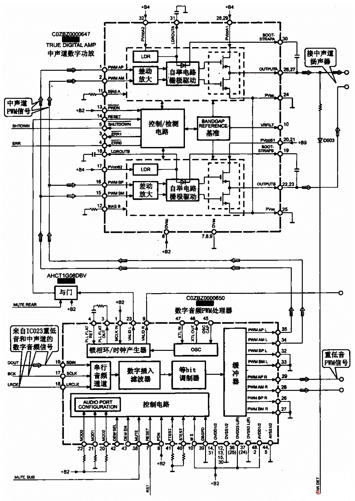 所示是PWM处理电路和数字功率放大的电路方框图,由于A/D转换器输出的信号不能直接与数字功率放大接口,因而先由PWM处理电路将串行数字音频信号转换成脉宽调制的信号(简称PWM).这是为了便于进行功率放大而开发的一种新型数字处理方式,这样就把结构复杂的多路数字信号,变成了一路简单的脉冲信号,数字功率放大实际上是一种脉冲功率放大器。在集成电路中的输出级采用双场效应管的方式,脉冲的高电平期间上面的场效应管道导通,下面的场效应管截止,脉冲的低电平期间,上面的场效应管截止、下面的场效应管导通。输出的脉宽调制信号经RC低通滤波器,即可变成模拟信号直送扬声器。功率放大几乎无失真。