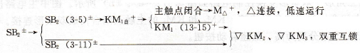 电动机定子绕组作YY连接,并且电源相序已改变,以高速同方向旋转。 (3)停止。SB1±→KM1-(或KM2-、KM3-)→M△-(或MYY-)。