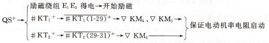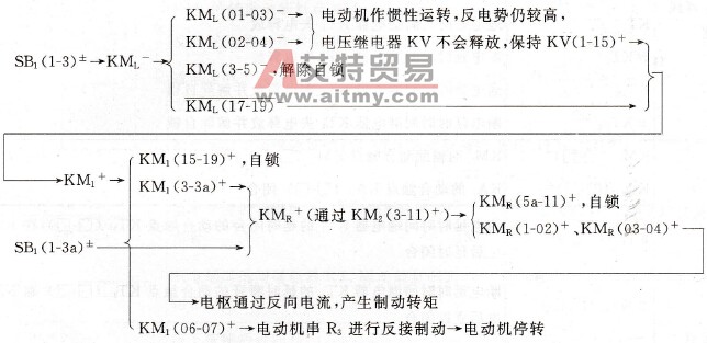 待转速降低达到KV释放电压时,KV释放,其动合触点KV (1-15)复位断开,KM1、KM2失电释放。KM1的动断触点KM1(06-07)复位闭合,短接电阻R3;同时其动合触点KM1 (3-3a)断开,使反向接触器KMR也失电释放,为下次启动作好准备。 (4)反向启动与制动。反向启动及制动的动作过程与正向的类似,不再赘述。
