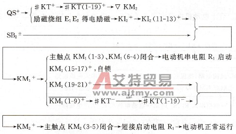 图1 并励直流电动机启动电路 电路工作情况如下。