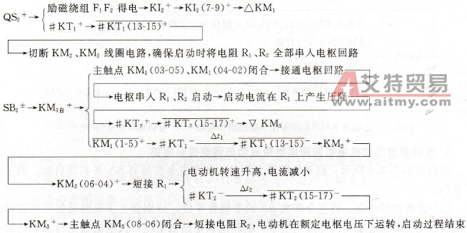 (2)停止。SB1±→KM1-、KM2-、KM3-→M-。 (3)电路保护环节。该电路由过电流继电器KI1实现电动机过载和短路保护;欠电流继电器KI2实现电动机欠磁场保护;电阻R3与二极管VD构成电动机励磁绕组断开电源时产生的感应电动势的放电回路,以免产生过电压。