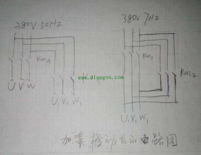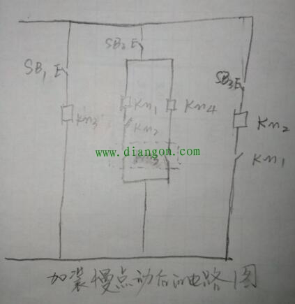 图中sB1为预备按钮,控制KM3。SB2为正转按钮,控制KM1。SB3为反转按钮,控制Km2,在不按预备按钮的情况下,点动正反转按钮机器皆为寸动,按下预备按钮后,再按正转按钮,机器进去正常运行状态。(http://www.diangon.com/版权所有)加装慢动就是以KM3为切点,利用它的动合、动开辅助触点来切换高低频电源。这是改装后的电路图