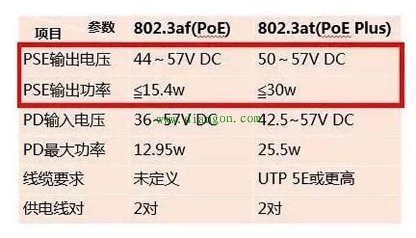 PoE交换机需要遵循供电标准,有两个,IEEE802.3af和IEEE802.3 at。分别定义了15.4W和30W的供电功率,但由于在传输过程中存在损耗,所以实际供电功率为12.95W和25W。