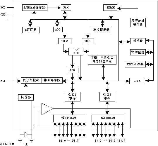 3. P1口:P1口是一8位双向I/O口。口引脚P1.2~P1.7提供内部上拉电阻。 P1.0和P1.1要求外部上拉电阻。P1.0和P1.1还分别作为片内精密模拟比较器的同相输入(AIN0)和反相输入(AIN1)。P1口输出缓冲器可吸收20mA电流并能直接驱动LED显示。当P1口引脚写入“1”时,其可用作输入端。当引脚P1.2~P1.7用作输入并被外部拉低时,它们将因内部的上拉电阻而流出电流(IIL)。 P1口还在闪速编程和程序校验期间接收代码数据。